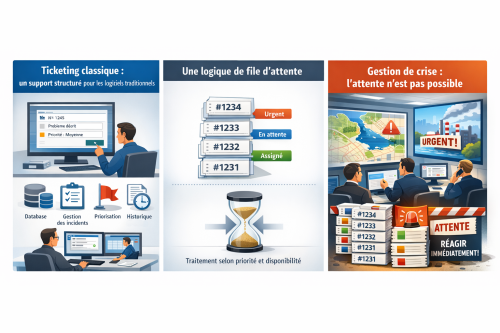 L'aspect bloquant du ticketing lorsque survient une crise tient à sa nature même : il organise l’attente. Même avec une priorisation « urgente », le système conserve une logique de file, de tri et d’affectation. Or, pendant un événement réel, le décideur n’a pas « une demande » à formuler : il a une action à exécuter. Il doit déclencher une campagne d’alerte, valider un message, choisir un périmètre, mobiliser des équipes, gérer un retour terrain. S’il rencontre un blocage au moment critique, l’ouverture d’un ticket ne résout rien : elle documente un problème, mais n’apporte pas l’intervention immédiate qu’exige la situation.